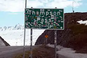 The pass was named in 1899 by U.S. Army captain William Abercrombie "in compliment to Hon. Frank Thomson, of Pennsylvania", but he spelled the name "Thompson" on his sketched map, and that spelling stuck.[1] The pass had been used by Alaska Native Ahtna people for generations prior to Abercrombie's arrival, but he marked and defined a trail through the pass for use by Klondike Gold Rush miners.[5] His route, which became the Valdez-Eagle Trail, later was used by the Washington-Alaska Military Cable and Telegraph System, which strung cables through Thompson Pass. The path through the pass continued to be improved, and automobiles first drove the entire length of the trail in 1913. By that point, it had become the Valdez-Fairbanks Trail, and it was renamed the Richardson Road in 1919.[6]