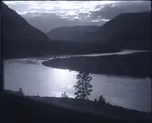 The Interior region of British Columbia was first populated after the retreat of the continental ice sheets of the last ice age. The ice moved out of the Thompson River region approximately 11,000 BCE, and migration by the ancestors of the Nlaka'pamux and Secwepemc people is thought to have occurred soon after.[9] Some of the older archaeological sites on the lower Thompson include the Drynoch Slide site, near Spences Bridge, with artifacts dating to about 7350 BCE, and the Landels site, near Ashcroft, which dates to older than 8000 BCE.[10] Archaeologists theorize early settlers lived in small groups, beginning with nomadic bands hunting ungulates on the plateaus around the river, who then established more permanent dwellings along the river benches as their fishing techniques developed.[11]