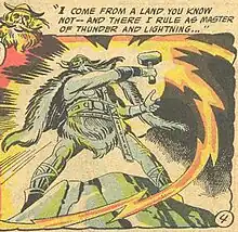 • Thor and Dynamite Thor: The Golden Age anthology Weird Comics by the Fox Feature Syndicate featured two characters named Thor. The first, seen in issues #1-5, is a mortal man given strange lightning powers by the Norse God.[7] Grant Ferrell was chosen by the real Thor, looking down at humanity from his perch in Valhalla. Thor decided to bestow powers on a mortal, and spied Grant, a meek man who lost his girlfriend Glenda at a nightclub. Thor picked Grant up and brought him to Valhalla, where he was trained in using the powers of lightning and Mjolnir, Thor's magic hammer. Grant returns to Earth dressed in a revealing costume — just trunks, a cape and a helmet. He rescues Glenda from a group of spies, and decides to devote his life to heroic deeds.[7] He goes on to fight spies and Germans.[8] That character lasted for five issues, and was then rebooted in issue #6 as a new character, Peter "Dynamite" Thor, with different powers, but the same girlfriend.[9] Dynamite Thor was a demolitions expert who was immune to the effect of explosives. He used dynamite to propel himself through the air.[10] He used his abilities to fight spies, mad scientists and the devious War Maniac.[8] Dynamite Thor appeared in Weird Comics #6 and 7, and then moved to Blue Beetle #6-8.[7]