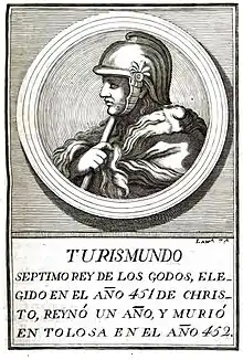 Thorismund (also Thorismod or Thorismud, as manuscripts of our chief source confusingly attest[1]) (c. 420–453), became king of the Visigoths after his father Theodoric was killed in the Battle of the Catalaunian Plains (also called Battle of Châlons) in 451 CE. He was murdered in 453 and was succeeded by his brother Theodoric II.