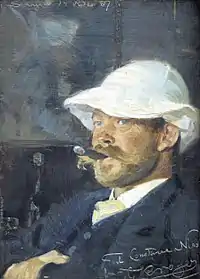 The broad strokes and strong colours he applied to his autumn and winter landscapes brought him wide recognition. In 1882, his Septemberdag i Jægersborg dyrehave won him a gold medal in Vienna and the following year a winter landscape of the Folehaven woods was bought by Statens Museum for Kunst, the Danish national gallery bringing him wider recognition. Thanks to a travel grant, in 1885 he went to Italy and Greece, and in 1889 to Paris. In 1887, he visited Skagen where he became a member of artists' colony known as the Skagen Painters. There he painted the sea, adopting a new approach to marine art with his Morgengry (1888) and Strandparti. Grenen (1889). He went on to paint marine scenes elsewhere, especially of the Mediterranean.[2] In the 1890s, he increasingly used etching for his marine scenes, some with symbolic undertones.[1]
