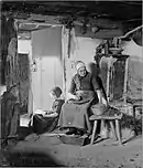 1860 Frederik Vermehren Huslig Syssel i en fattig Bondestue; en Kone bælger Ærter