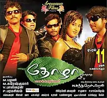 Thozha (transl. Mate) is a 2008 Tamil-language film which released on 11 April 2008. Nithin Sathya, Ajay Raj, Premji, Vijay Vasanth and Soumya Bollapragada play the lead roles while Nancy Jennifer, who has appeared in sister roles in Ghilli and Jambhavan is making her debut as a heroine. Those four actors have already worked together in (Chennai 600028).