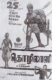 Thozhilali (transl.Worker) is a 1964 Indian Tamil-language film directed by M. A. Thirumugam and produced by Sandow M. M. A. Chinnappa Thevar who also wrote the story. Inspired by Thevar's early life as a milk supplier before he became a wealthy film producer, it stars M. G. Ramachandran, K. R. Vijaya and newcomer Rathna. The film was released on 25 September 1964 and became a box-office success.