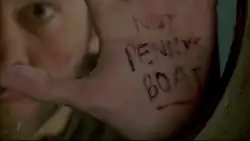 Charlie Pace (Dominic Monaghan) is captured by the resident Others Greta (Lana Parrilla) and Bonnie (Tracy Middendorf). Ben Linus (Michael Emerson) learns of Charlie's infiltration and sends Mikhail Bakunin (Andrew Divoff) to the station to kill the three to preserve the signal jamming. Mikhail arrives and kills Greta and Bonnie, only to be shot through the chest with a spear gun by Desmond Hume (Henry Ian Cusick) who emerges from a closet where he had hidden after diving down a short time after Charlie. Getting the code from Bonnie before she dies (the notes to the middle eight of "Good Vibrations" by The Beach Boys), Charlie disables the jammer, and is contacted by Penny Widmore (Sonya Walger) via video transmission. Penny informs Charlie that she does not know Naomi, and did not send the boat that Naomi claims to be from. Despite his injury, Mikhail manages to swim out of the station and blasts the window of the jamming room with a grenade, killing himself and flooding the communications room.[9] Charlie locks the door to save Desmond from drowning with him, but before he drowns, Charlie writes on his hand so Desmond can read: "NOT PENNY'S BOAT".[8]