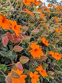 Thunbergia gregorii, commonly known as orange clockvine or orange trumpet vine, is a herbaceous perennial climbing plant species in the family Acanthaceae, native to East Africa and sometimes cultivated as an ornamental vine. The bright, pure all-orange flowers distinguish it from the related black-eyed Susan vine (Thunbergia alata).[1]