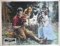 Lobby card showing Thunder and White Fawn watching actors hold their puppies in Wings of the Storm (1926)