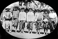 Photograph of Rotenese men in early 20th-century featuring the ti'i langga in various plume shapes.