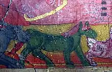 The support for wall paintings is made of earthen plaster, usually consisting of more than one layer of earthen plaster, in which the last layer was rendered as smoothly as possible. The support was covered by a smoothened ground, generally in white. Materials employed for the ground may be kaolin, chalk or gypsum, or any other white material deriving from an inert mineral.[2] To organise the painting, preliminary sketches were carried out. Generally this involved the geometric layout of the design with the help of snapped lines and/or rulers.[3] Compasses were employed mainly for the construction of mandalas. Figures were roughly sketched, and then rendered with precise contours. These outlines are usually in black.[4] Repetitive designs were in some cases achieved with the use of stencils.[5]