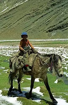 The Tibetan pony is a horse breed originating in Tibet. Once thought to be simple hardy mountain ponies developed from Mongolian stock, recent research indicates that there may be up to six separate horse breeds native to Tibet.[1]