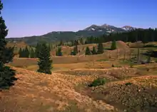 The Tierra Amarilla ("Yellow Land" in Spanish Land Grant is about 40 mi (64 km) from north to south and 25 mi (40 km) east to west, occupying a large portion of Rio Arriba County, New Mexico and a small portion of Archuleta County Colorado. The land begins at the Rio Nutrias in the south and extends northward to the south San Juan Mountains of Colorado. Most of the land is mountainous. The lower elevations are semi-arid and vegetation is grassland and Pinyon pine woodland. Conifer forests are found at higher elevations. Elevations on the grant range from 6,653 ft (2,028 m)[4] at the junction of the Nutrias with the Rio Chama in the south to 12,778 ft (3,895 m) at Banded Peak in Colorado.[5] Two small towns are in the grant area: Tierra Amarilla (population 297 in 2020) and Chama (population 917). Chromo is a community at the edge of the grant in Colorado.[6][7] The former town of El Vado, which in 1910 had a population of 1,000, is now beneath the waters of El Vado Lake.[8]