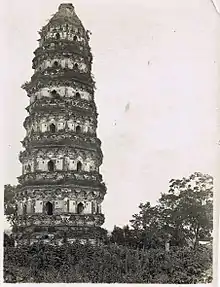 The Tiger Hill Pagoda or Huqiu Pagoda (Chinese: 虎丘塔; pinyin: Hǔ qiū tǎ; Suzhou Wu: Hou chieu thaeh, Wu Chinese pronunciation: [hou tɕʰʏ tʰɑʔ]), officially the Yunyan Pagoda[1] (Chinese: 云岩寺塔; pinyin: Yún yán sì tǎ; Suzhou Wu: Yuin nge zy thaeh, Wu Chinese pronunciation: [ɦʏn ŋe̞ zz̩ tʰɑʔ]), is a Chinese pagoda situated on Tiger Hill (Huqiu) in Suzhou city, Jiangsu Province of Eastern China. It is nicknamed the 'Leaning Tower of China'.[1]