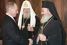 Russian President Vladimir Putin, Patriarch of Moscow and All Russia Alexii II, and head of the Greek Orthodox Church Archbishop Christodoulos of Athens and all Greece, at the Kremlin in Moscow.