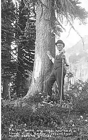 The first settler upon the slopes of Mount Rainier itself was James Longmire, an American who came to Washington Territory in 1853 with his family via the overland Naches Pass route.[4][8][9] Longmire and his family settled in Yelm, Washington, in the valley below Mount Rainier.[4][8] His home became a launching point for a number of exploratory trips to Mount Rainier.[4][8] In the 1860s, Longmire was involved in surveys of the Nisqually River region at the base of Mount Rainier leading to his eventual employment as a guide for the 1870 ascent of Mount Rainier.[4][8] Longmire would go on to locate a mineral claim at the base of Mount Rainier, leading to an increase of prospectors to the region and eventually an increase in tourists after, with the aid of some local American Indians, they cleared a road from the Succotash Valley to the springs and established Longmire hotel and health spa in 1884.[10][8][9]