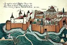The name Castrum Tymes (Thymes, Temes, Castrum Temesiensis, Castrum Temesvariensis[6]) is found for the first time in documents in the 13th century.[18][19][20] After his first visit to Timișoara, in the fall of 1307, Charles I of Hungary built the first stone fortress (Hungarian: Temesvári vár[21]) between 1308 and 1315, on the site of an existing clay fortress, using Italian craftsmen.[12][21][22][23][24][25] The reason for choosing this site was that the Mureș and Tisza rivers, the Danube and the mountain passes of western Romanian Carpathians prevented surprise attacks.[26]