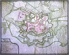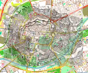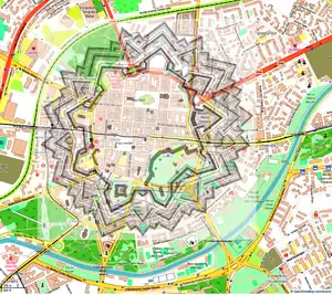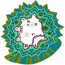 The vertical profile of the fortifications was of Vauban type, with three wall belts, each facing floodplains.[141][142] The first wall belt, whose parapets are represented in red, consisted of nine bastions and curtain walls. The bastions and the ravelins were numbered with Roman numerals, clockwise, beginning with the ones from the northeast (similar to the figures on the dials of the clocks).[143][144] The bastions were: