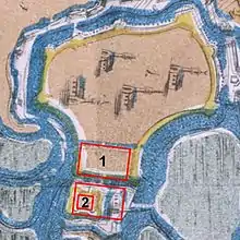 The Counterguard had four gates: the Rooster's Gate (Z), the Sedi Pasha Gate (V), the Osman Aga Gate (X), and Aghas' Pasha Gate (Y).[96] Palanca Mare could be entered in through the Gate of the Long Toggle Bridge (in the northwest, in front of the Rooster's Gate), the Forforos Gate (&), the Martoloz Gate (2) and the Customs Gate (in the northeast, 3). Palanca Mică could be entered through the Gate of Belgrade (4).[96][97]