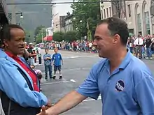 Kaine had a largely apolitical childhood, but became interested in politics in part due to the influence of his wife's family and his experience attending Richmond city council meetings.[7] In 1994, he was elected the 2nd district member of the city council of the independent city of Richmond, defeating incumbent city councilor Benjamin P.A. Warthen by less than 100 votes.[20] He took his seat on July 1 and retained the position until September 10, 2001, when he resigned and William J. Pantele was appointed to succeed him.[21][22][23] He defeated the incumbent city councilman Benjamin P. A. Warthen by 97 votes.[24] Kaine spent four terms on the city council, the latter two as mayor of Richmond.[16][25]