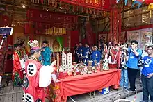 The Che Kung Temple in Tai Wai was built and initially managed by Tin Sam Village. The village lost its managerial rights in the late 19th century in a lawsuit against the Kau Yeuk (九約, "Alliance of Nine" [villages]), a regional organization of various groups in Sha Tin Valley, that was settled in a lawsuit at the yamen. The Kau Yeuk had provided evidence that it made significant contributions to the renovation of the temple. The Kau Yeuk could prove its case by referring to the rhymed couplets that were inscribed on both sides of the main entrance and that bore its name.[6] The temple was subsequently jointly managed by nine villages of Sha Tin, while Tin Sam Village continued to enjoy some privileges in the worship of Che Kung.[7][8] Since 1936, the temple has been administered by the Chinese Temples Committee.[8]