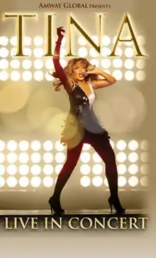 Originally known as "Tina!: Live in Concert", Turner decided to have the tour commemorate her fiftieth year performing on stage. Turner first performed at Club Imperial with Ike Turner and the Kings of Rhythm in 1958 (at the time, Turner was known as "Little Ann").[10] The tour was sponsored by Amway Global and received early praise from the media and fans.[11] Tour dates were announced in May 2008. While promoting the tour on The Early Show, Turner stated she was ready to return to perform in America and perform in familiar cities.[12] She followed with saying she wanted the tour to start in Missouri since that is where her music career began. Rehearsals for the tour began in late September 2008 at Sprint Center in Kansas City. Production rehearsals began in July 2008 in Hershey, Pennsylvania. The singer gave Access Hollywood an exclusive backstage glimpse at rehearsals and a photoshoot for the tour and upcoming album, Tina!: Her Greatest Hits. The success of the tour was immediate as many shows sold out within minutes. Turner announced additional dates in the United States and release dates for Europe.[13] The tour was a triumph for Turner and continued her success as one of the biggest concert draws in history. The show was recorded for a live album and DVD release entitled, Tina Live.