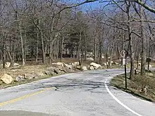 Tiorati Brook Road is a scenic road located within Harriman State Park in southern New York in the United States. The highway extends for 3.6 miles (5.8 km) between Tiorati Circle, a traffic circle connecting Tiorati Brook Road to Seven Lakes Drive in Orange County, and an interchange with Lake Welch Parkway just west of where that parkway ends at Palisades Interstate Parkway in Rockland County. The road crosses over the county line roughly midway between the two locations. Tiorati Brook Road is owned and maintained by the Palisades Interstate Park Commission.