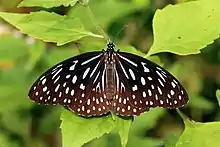 Tirumala septentrionis (Butler, 1874)dark blue tigerSikkim, into Assam, Myanmar, Cambodia and Southeast Asia; Odisha; West Bengal, southern India, the Western Ghats and Nilgiris; Sri Lanka