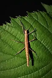 The females lay an egg in the ground several times a week. The eggs are 5.1 millimetres (0.20 in) long and 2.8 millimetres (0.11 in) high, brown and hairy. The lid (operculum) sits at an opercular angle of approx. 20 ° on the egg. As with many Obriminae, the micropylar plate forms an upside-down "Y". When hatched, the nymphs are about 15 millimetres (0.59 in) long, slender and brown in color. While the males remain slim and gradually develop their later shape and color in the course of the next molt, the female nymphs become increasingly broader and more contrasting in color until they show their maximum pattern and color variance as subadult animals. Adults of both sexes can live more than a year.[7][8]