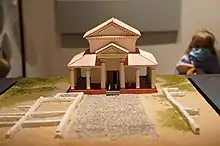 A deep ditch, 4 m wide, perpendicular to the road, separated the residential space from the public space. The residential area covering about 30 ha consisted of rectangular houses, 14 m long by 8 m wide, built of light masonry. They were equipped with fireplaces and sometimes ovens. Trenches to drain rain water among the houses were also discovered. In the public space, the remains of a large hall, 14 m square, have been found, but no dwellings were discovered. This could have been a meeting place for political, economical and/or religious purposes.