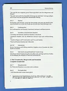 These goals are of a programmatic nature, and are declared not to be directly enforceable. They are also counterbalanced by a reference to individual responsibility in article 6. This means that, contrary to many other Western constitutions, so-called positive or second- and third generation rights are mostly absent from the constitutional text, although they are more widely recognised in legal doctrine and practice.[53] Even so, the inclusion of this provision in the constitution was strongly contested on grounds of economic policy and cantonal autonomy.[54]