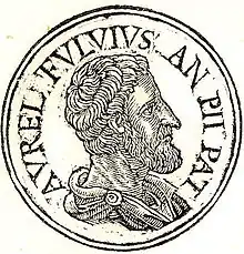 Titus Aurelius Fulvus was ordinary consul in 89 with Marcus Asinius Atratinus as his colleague.[1][2] This Fulvus has been described by Augustan History as a "stern and upright man". The younger Fulvus married Arria Fadilla, a daughter of the consul Gnaeus Arrius Antoninus and friend to the historian Pliny the Younger. Their only child was Titus Aurelius Fulvus Boionius Arrius Antoninus, who was born in Lanuvium (modern Lanuvio), Italy, on 19 September 86; who was raised by Fulvus' father-in-law after his early death. This son became the emperor Antoninus Pius.