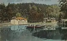 The current pond was dug in 1880 on the order of the Ljubljana City Council as a fire-fighting water reservoir for a fire brigade from the neighbourhood of Rožna Dolina.[6] Three years later, it was expanded at its southern side, and covered an area of around 8,500 square kilometres (3,300 sq mi).[26] It was populated with goldfish and other ornamental fish, and European tree frogs heard quite far towards the Ljubljana downtown, at least to Župančič Street (Župančičeva ulica).[24][27] It was used for boating and ice skating.[20] At first,[24] the pond was managed by the Laibacher Eislaufverein skating club, which built pavilions for skaters and spectators at a certain distance and a covered[24] changing area[28] all of them constructed in a Vienna Secession style.[10] It also arranged the surroundings, among other things it planted seven trees at the upper part of the pond, as evident from postcards and photos from around 1900.[24]