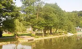 Tivoli Pond is located in the circular plateau of the CR 3/1 (part) Tivoli arrangement area.[8] The area is situated in the southeastern part of Tivoli Park in the immediate vicinity of the Cekin Mansion,[9] along an avenue that was planted in the 1860s.[10][11] On the western bank of the pond, there are two wooden peninsulas, frequently occupied by young people.[12] A cafe operates at the northwestern end of the pond,[13] in a half-wooden half-concrete building of a former changing-area.[4][14][15] It is the only restaurant in this part of the park.[16] On a lawn besides the pond, an open-air library operates in warm weather and a workshop on recycling books and other printed matter, called "The Read Ones."[15][17] There is a small bronze plastic next to the middle of the western bank of the pond, named Ribe ("Fish"). It is a depiction of two vertically standing fish, created by the expressionist sculptor France Kralj in 1935 and put in the pond in 1994.[18] At the northern end of the pond stands a drinking fountain.[19] Access to water is prevented by trees of the species such as the alder, the willow, the hornbeam, and shrubs.[20] In the vicinity,[21] a staircase leads towards Tivoli Castle.[22] On the steep eastern bank right next to the water grows the hornbeam, preventing erosion.[20] On its upper edge, a wooden fence stands and a barberry hedge has been planted.[20] Besides it, there is a footpath.[20] Next to it, a children's playground has been arranged.[7] On the southern bank, there are a concrete bank, two wooden peninsulas, marsh plants and climbers, a wooden fence and a paved lookout plateau behind it.[23] There are also some shrub species.[20]