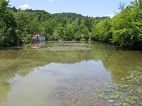 There are three inflows to the pond. The biggest and the most constant is the inflow at the northwestern corner of the pond. It supplies the pond with the water from the southwestern part of Šiška Hill and from a forebay on Rožnik Hill. It appeared for the first time during World War II. The second inflow is a forest creek that flows in the pond near its northeastern corner. Both are installed through a sewer. The third inflow is a forest creek on the northern side of the pond. It is regulated and arranged as a park. In addition, the pond receives surface runoff from the playground, the trails, and the depressions around it.[20] To achieve partial circulation of the water, inflow to the centre of the pond was arranged at its northern side in 2011.[3]