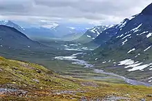Tjäktjapasset is a mountain pass about 1100 meters above sea level in the Kebnekaise area, Kiruna, Sweden. The Kungsleden trail runs in a north-south direction through this pass, connecting Sälka, which lies 9 km away, and Tjäktja, lying approximately 4 km away.[1] There is also a shelter, where travellers are advised to remain if weather becomes harsh.