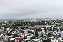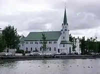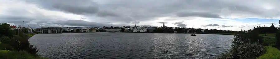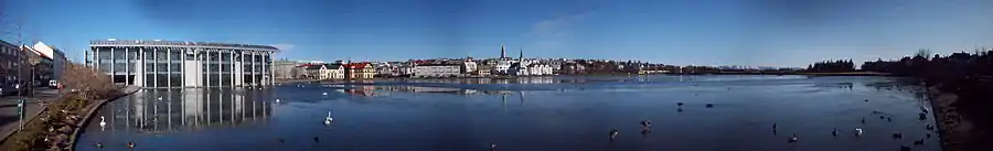 The earliest urban development of Reykjavík took place between the lake and the northern coast of the peninsula. Over the years, the lake became an integral part of the urban environment. Development of the city has centered around the lake. The postmodern City Hall, Ráðhúsið, stands in the northwest corner on the edge of the lake: it looks as if it is rising out of the lake.[14] Other notable buildings in the area are those of the Supreme Court, Reykjavík Art Museum, the National Museum, the Living Art Museum, Reykjavík City Library, and the National Theatre, as well as the Parliament building, which houses the Parliament of Iceland, and the Dómkirkja cathedral,[15] apart from a shopping complex and restaurants.[16] Several buildings belonging to the University of Iceland are also close by.[17]