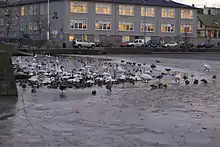The lake is frequented by between 40 and 50 species of water birds, including the Arctic tern, the Eider, the Gadwall, the Greylag goose and other species of goose, the Mallard, several species of seagulls, and the scaup.[8][9] Whooper swan are viewable within close proximity.[10] The Arctic tern’s arrival heralds the start of summer.[11] Birders from all over the North Atlantic come to pursue their hobby in the lake area. The lake is also a favorite place to take young children to watch and feed birds.[6] The popularity of bird feeding has led to the lake being poetically referred to as "the biggest bread soup in the world" (stærsta brauðsúpa í heimi).[12] Lately, however, preying seagulls have caused the City Council to issue warnings to residents, asking them to refrain from feeding the ducks in Tjörnin to avoid putting ducklings at risk.[13]