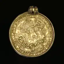 The Tjurkö bracteates were discovered in 1817 near Tjurkö when cultivating, for the first time, a field on a stony hill.[1] The bracteates were found in the roots of the grass among the rocks. Also discovered with the bracteates was a gold coin of the Emperor Theodosius II of the Eastern Roman Empire that has been dated to 443 AD.[1]
