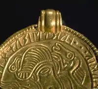 There is a consensus that walha-kurne is a compound word referring to the bracteate itself, and that walha (cognate with Modern English Welsh) means "foreign, non-Germanic" - here perhaps more specifically "Roman" or "Gallic." However, differing explanations have been proposed for the second element kurne. According to one interpretation, kurne is the dative singular of kurna (cognate with Modern English corn), and walha-kurne "Roman or Gallic grain" is a kenning for "gold;" cf. the compounds valhöll, valrauðr and valbaugar in the Old Norse poem Atlakviða.[3] This may refer to the melting of solidi as source of the gold for the bracteate.[3] An alternative interpretation of the second element sees kurne as an early loan from Latin corona "crown,"[4] but this is now considered to be unlikely since "crowns" as currency appear only in medieval times, from images of crowns minted on the coins' faces. The personal name Heldaz is derived from *held- "battle" (Old English hild, Old Norse hildr, etc.), while Kunimundiu (dative singular of Kunimunduz) is from kuni- "kin" (which appears with connotations of royalty as the first element of Old English compounds, cf. Modern English king) and mund- "protection."