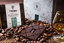 The company's products include the Vintage 2014 edition that was aged for three years in a French oak cognac cask.[13] The company ages bars in wood casks and empty spirit casks.[14][15] They have been described as a "boundary-pushing chocolate company"[16] for launching a bar of dark chocolate that has been aged for 18 months in a 50-year-old Cognac cask.[17] They have also aged chocolate for two years in a Laphroaig Islay whisky cask.[18]