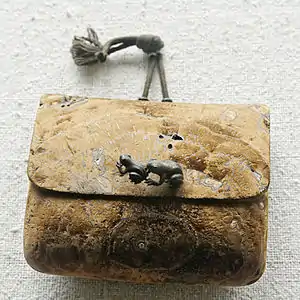 Tobacco pouches date back to traditional Japan, and appear in artwork dating back to the 17th century.[1] They were also made in Canada in the early 1900s.[2] A tobacco pouch is a vital clue in the Sherlock Holmes short story The Adventure of Black Peter. Along with boots, tobacco pouches were one of the first uses of the zip.[3]