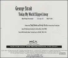"Today My World Slipped Away" is a song co-written and first recorded by American country music artist Vern Gosdin. Gosdin's version was released in October 1982 as the fifth single and title track from his album Today My World Slipped Away. Gosdin's version reached number 10 on the Billboard Hot Country Singles chart. George Strait released a cover of the song in September 1997 as the third single from his album Carrying Your Love with Me. Strait's version reached number 3 on the Billboard Hot Country Singles & Tracks chart in November 1997.[1] Gosdin wrote the song with Mark Wright.