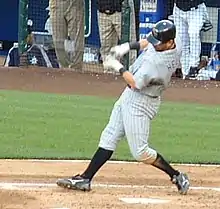 The following season, Helton had to spend time on the disabled list again, this time from April 20 to May 4, 2006, as he was diagnosed with acute terminal ileitis.[35] He hit .302 with 15 home runs, 81 RBI, 40 doubles, 91 walks and a .404 on-base percentage for the season.[35] He ended the season below .900 in OPS (he had .880 OPS) for the first time since entering the league in 1997 when he only played 35 games that year.[19] Helton finished third on the Rockies roster in 2006 in runs (94), hits (165), doubles (40), total bases (260) and multi-hit games (42).[35]