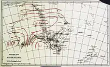 The folios grew out of Todd's desire to inform the colonists of South Australia of the immense size of weather systems and that in southern Australia, they generally progressed from west to east and not from east to west as commonly assumed by the early colonists.[2] To accomplish this, Todd displayed daily the last 6 synoptic charts for public viewing then bound and stored them in the folios.[3] The Todd weather folios consist not only of synoptic charts, but also include clippings from newspapers detailing weather statistics and events for all the eastern colonies of Australia. Newspapers from Brisbane, Sydney and Melbourne were collected as they came off the inter-colonial trains and were processed for pasting up next to the corresponding synoptic chart.