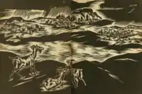 In 1937, Shteyn published a volume of about sixty woodcuts by Geller called From Land to Land, produced as part of the Federal Art Project (FAP), the visual arts arm of the Great Depression-era New Deal Works Progress Administration (WPA) Federal One program in the United States.[4][8][25] The cover featured a goat on the shore of Lake Michigan with Chicago's skyline in the background.[2] As an important staple of Jewish life in Eastern Europe that were believed to have mystical qualities, goats were a dominant symbol in Geller's artistic vocabulary.[2] The woodcuts, four of which were in color, illustrated Jewish life, in addition to Native American, Spanish, Mexican, and Midwestern American themes.[27]