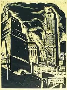 ![]() Chicago Towers, 1937, woodcut on paper, 10 x 8 in., Collection of the Illinois State Museum. Produced as part of the Works Progress Administration Federal Art Project. | |