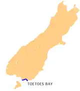 Toetoes Bay is the easternmost of three large bays lying on the Foveaux Strait coast of Southland, New Zealand, the others being Te Waewae Bay and Oreti Beach. The 240 km Mataura River drains to sea at Toetoes Bay, first passing through the Toetoes Harbour estuary. Thirty kilometres (20 miles) in length, the bay is the southern end of the Awarua Plain, an area of swampy land stretching inland for about fifteen kilometres (10 miles). The eastern end of the bay is close to Slope Point, the South Island's southernmost point, and the western end of the Catlins.[1]