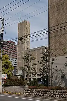 The cathedral is situated between Tange's Peace Memorial Park and JR Hiroshima Station. The volumetric treatment of the design was influenced by Auguste Perret, whereas the inclusion of a circular dome over the sanctuary and small cylindrical chapels on either side of the main volume are echoes of Byzantine architecture.[24] The post-and-beam concrete frame with internal panels is reminiscent of traditional Japanese architecture as are the shapes of the windows penetrating the tower. The brick infills in this case were made from earth containing ashes from the atomic bomb and are laid so that their rough surfaces cast shadows across the façade. Architect Kenji Imai designed the sculptures above the main door. Murano undertook a number of religious projects after this one and converted to Catholicism later in life.[25]
