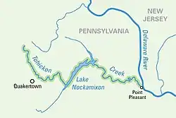 Tohickon Creek is a 29.5-mile-long (47.5 km)[1] tributary of the Delaware River. Located entirely in Bucks County, in southeastern Pennsylvania, it rises in Springfield Township and has its confluence with the Delaware at Point Pleasant. It is dammed to form Lake Nockamixon.