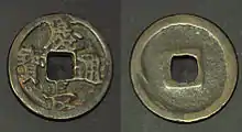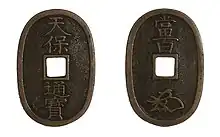 In 1835 the Tokugawa government started minting copper 100 mon named Tenpō Tsūhō (Kyūjitai: 天保通寶 ; Shinjitai: 天保通宝) as a way to solve its budgetary deficit, as the coin contained only 5½ as much copper as a 1 mon Kan'ei tsūhō this eventually lead to inflation.[7][8] This was later followed by the Satsuma Domain issuing a 100 mon coin of their own in 1862 to supposedly produce currency for the Ryukyu Kingdom, while in reality doing it to boost their own economy. These Ryūkyū Tsūhō (琉球通寳) coins eventually started circulating in other provinces as well.[9][10][11]