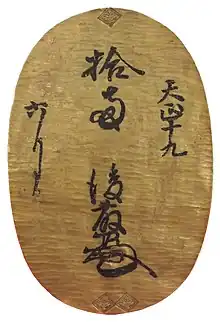 The Ichibuban (一分判) could be either made of silver or gold, in which case it was a quarter of a Koban. The gold Ichibuban of 1714 (佐渡一分判金) had a weight of 4.5 g, with 85.6% of gold and 14.2% of silver. The silver Ichibuban from 1837 to 1854 (Tenpō Ichibugin, 天保一分銀, "Old Ichibuban") weighed 8.66 g, with an alloy of 0.21% gold and 98.86% silver.[5]